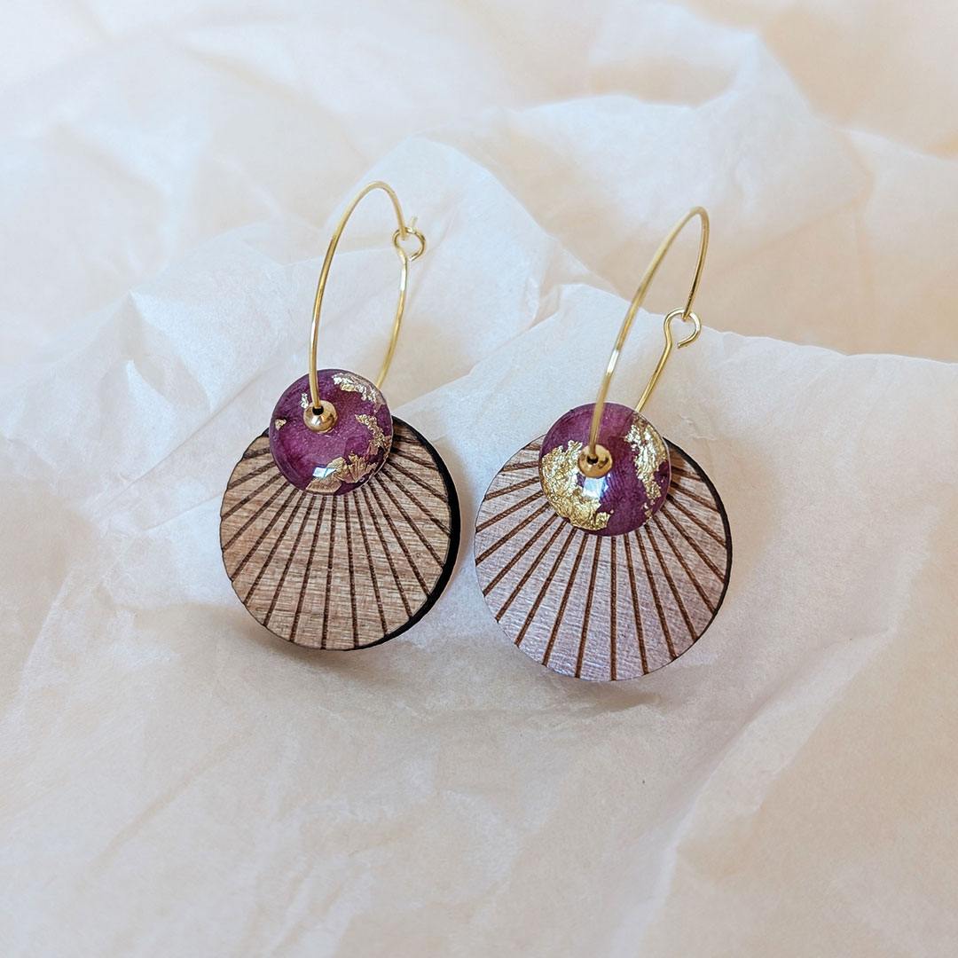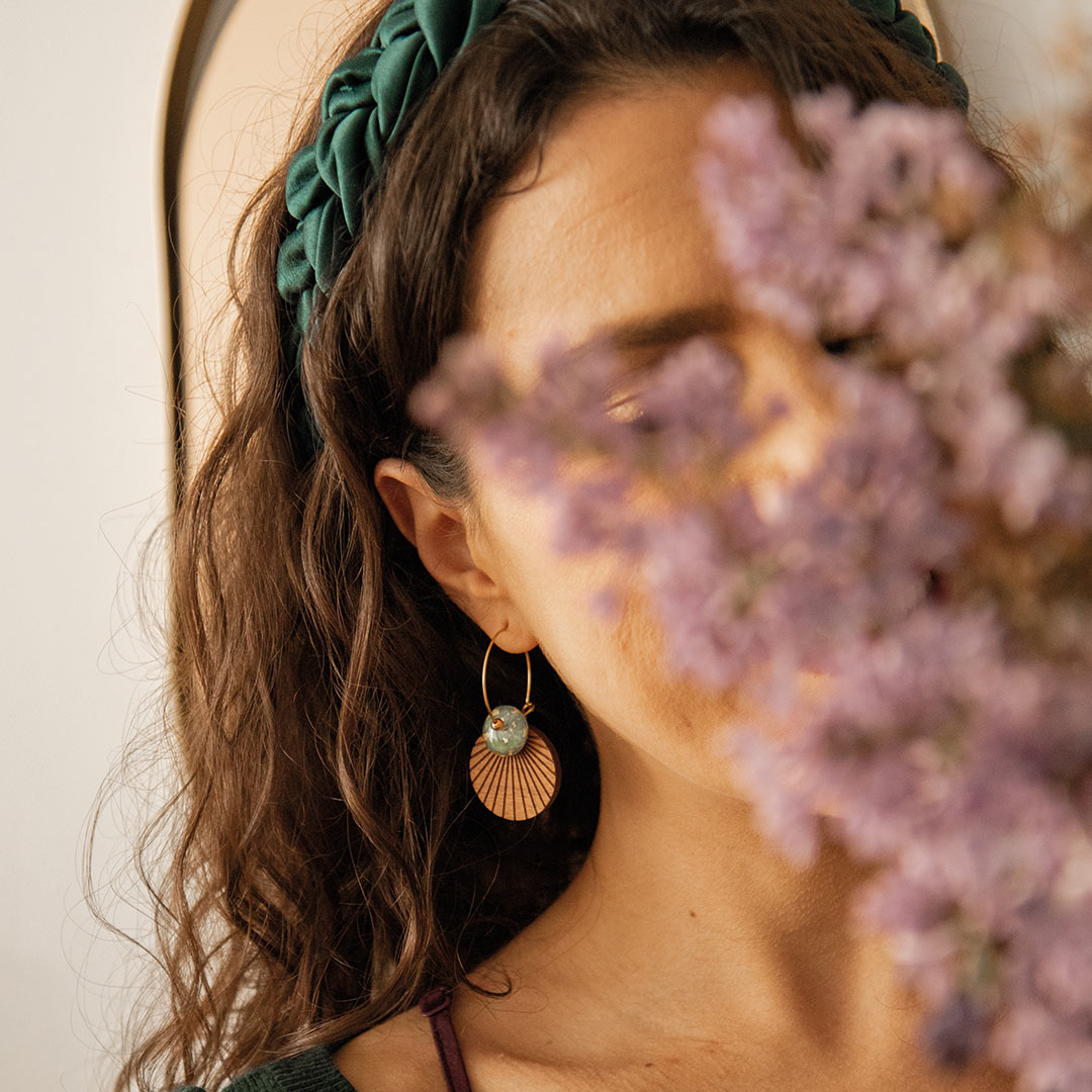 Les boucles d’oreilles en bois et papier résiné SOLIS ont été imaginées en collaboration avec Minoë.